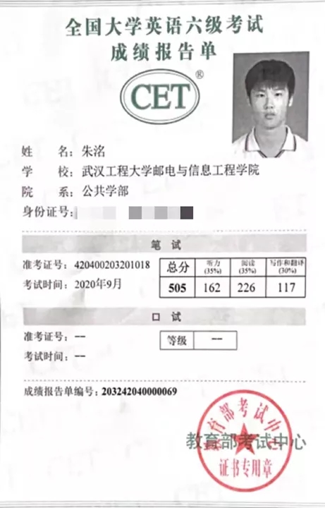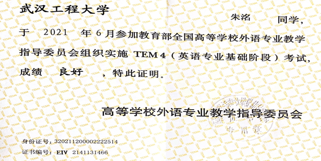 通过努力,顺利通过了全国大学英语四六级考试,TEM4成绩良好。