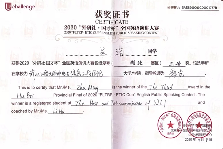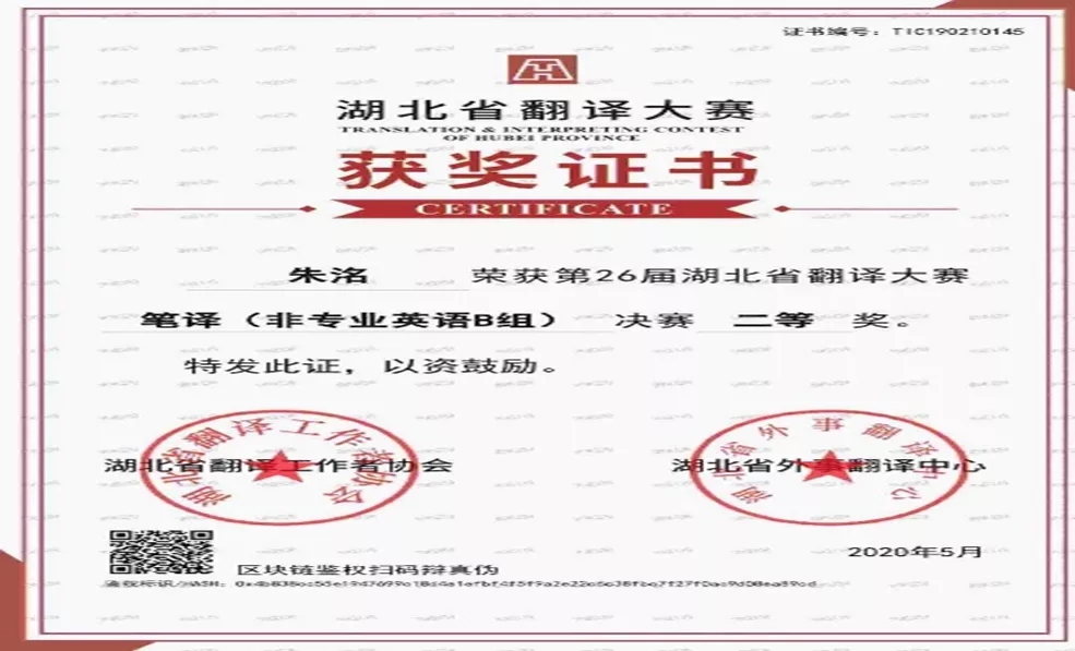 荣获第26届湖北省翻译大赛笔译(非专业英语B组)决赛二等奖,第九届全国口译大赛(英语)湖北赛区复赛三等奖、南部赛区大区赛优秀奖,2020“外研社•国才杯”全国英语演讲大赛省级复赛湖北赛区三等奖。