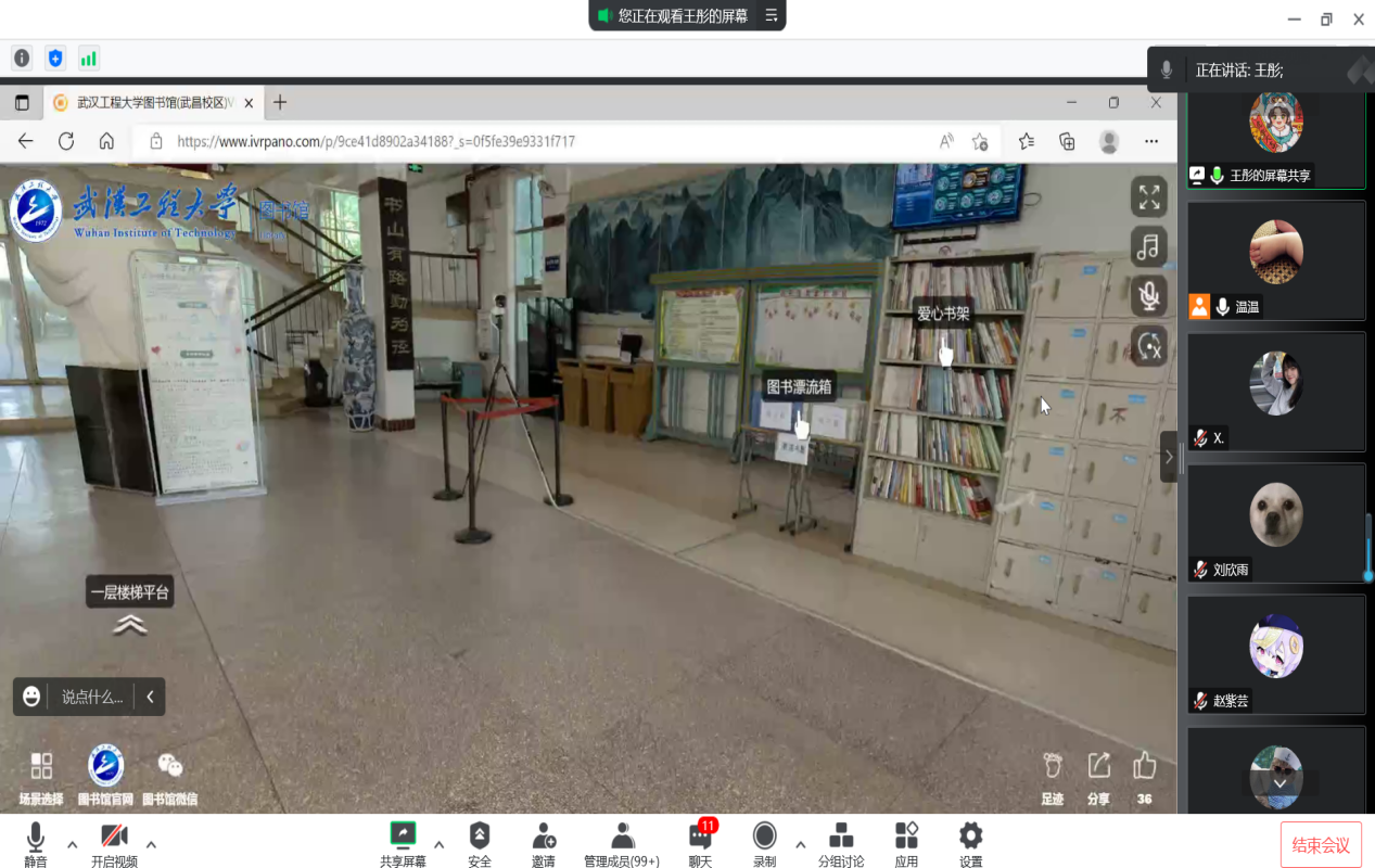 随后,19级英语专业王彤同学用VR视频带领新生们云参观了校图书馆,帮助大家更好的熟悉图书馆,有效利用馆藏资源。讲解中,王彤同学耐心地为新生们讲解了图书馆楼层布局,书籍预约、借阅、续借等服务流程。还贴心地回答了自习室开放时间等同学们非常关心的问题。