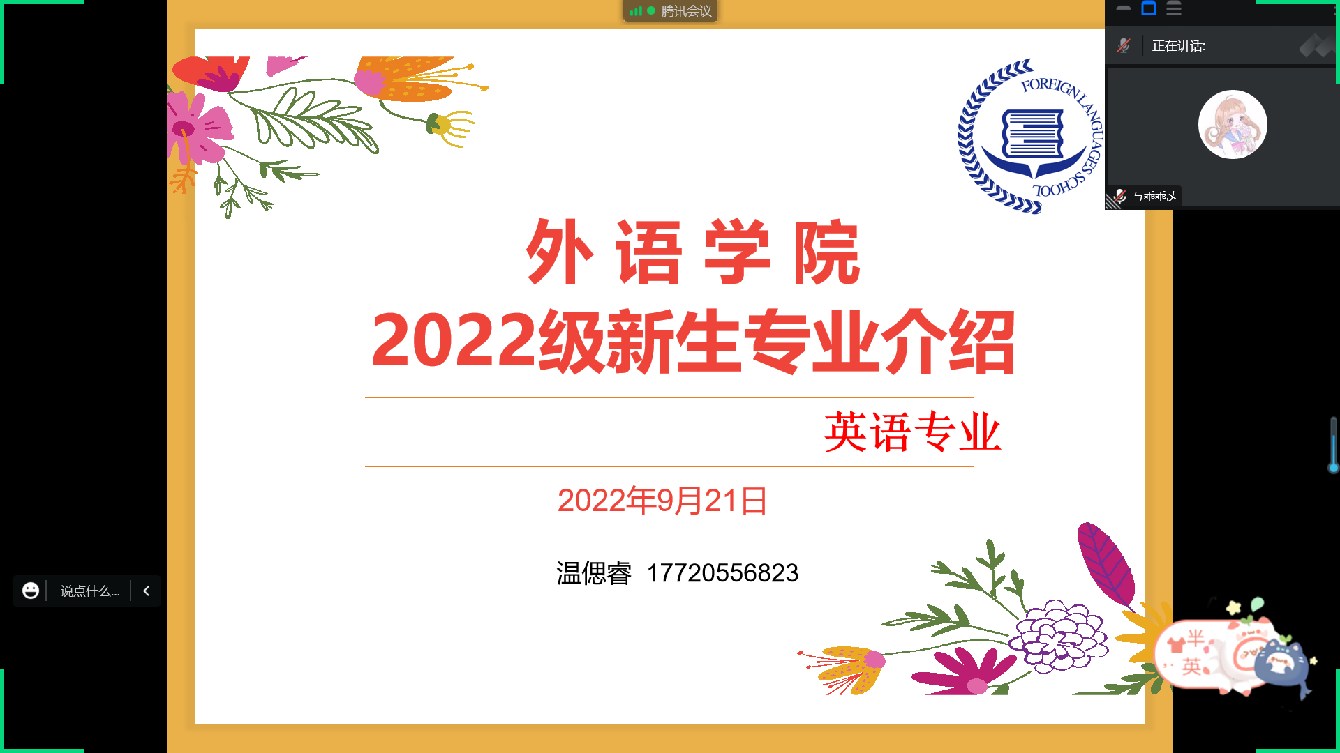 (通讯员 温偲睿)为帮助2022级新生尽快树立专业认同,激发学习热情,明确奋斗目标,外语学院于9月21日晚7点采用线上会议形式开展了2022级新生专业认知教育和入馆教育。外语学院党总支书记、院长李春英、外语学院副院长温偲睿、外语学院党总支副书记、新生年级组长齐君、英语专业教研室主任陈平香、新生班主任王蒙、在校生代表19级英语专业王彤以及外语学院2022级全体新生参加了本次会议。