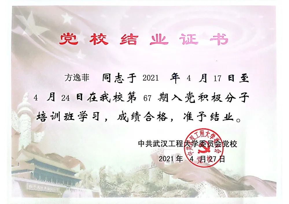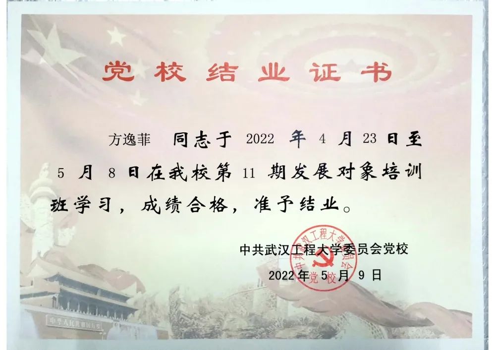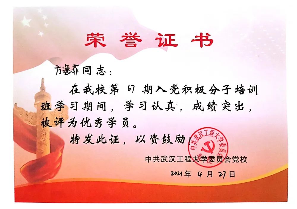 2020年9月向党组织递交了入党申请书,2021年4月参加第67期入党积极分子培训班学习,被评为“优秀学员”;积极参加党组织的各项活动,2022年5月顺利发展成为中共预备党员。