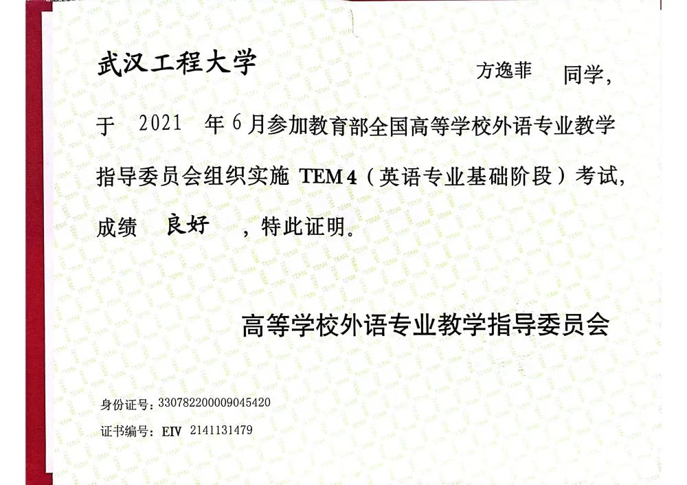 学习认真刻苦,连续三年专业成绩均排名年级第一。大三学年专业成绩94.27分,综测成绩86.66分。十余门专业课成绩达93分以上,其中三门专业课达99分。通过不懈努力,通过大学英语四六级考试;英语三级笔译;英语专业四级考试成绩良好。