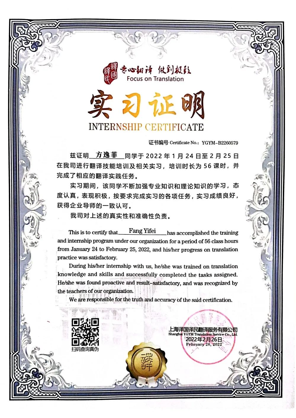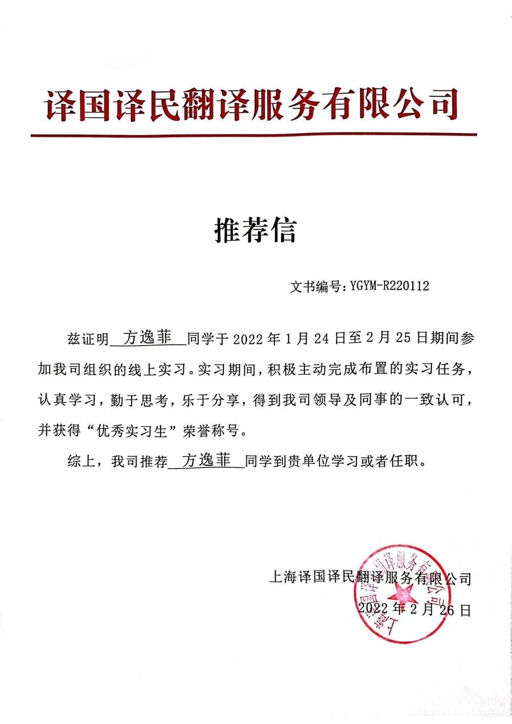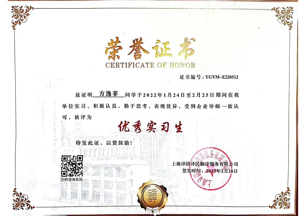 2022年寒假期间,积极报名参加译国译民翻译公司的线上实习活动,认真学习,勤于思考,得到公司领导的一致认可,并获得了“优秀实习生”的荣誉称号及公司的推荐信。