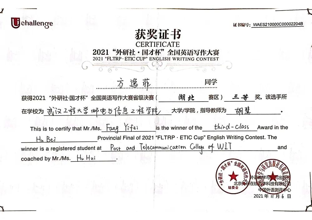 2021年11月荣获“外研社·国才杯”全国大学生英语写作大赛决赛(湖北赛区)三等奖。