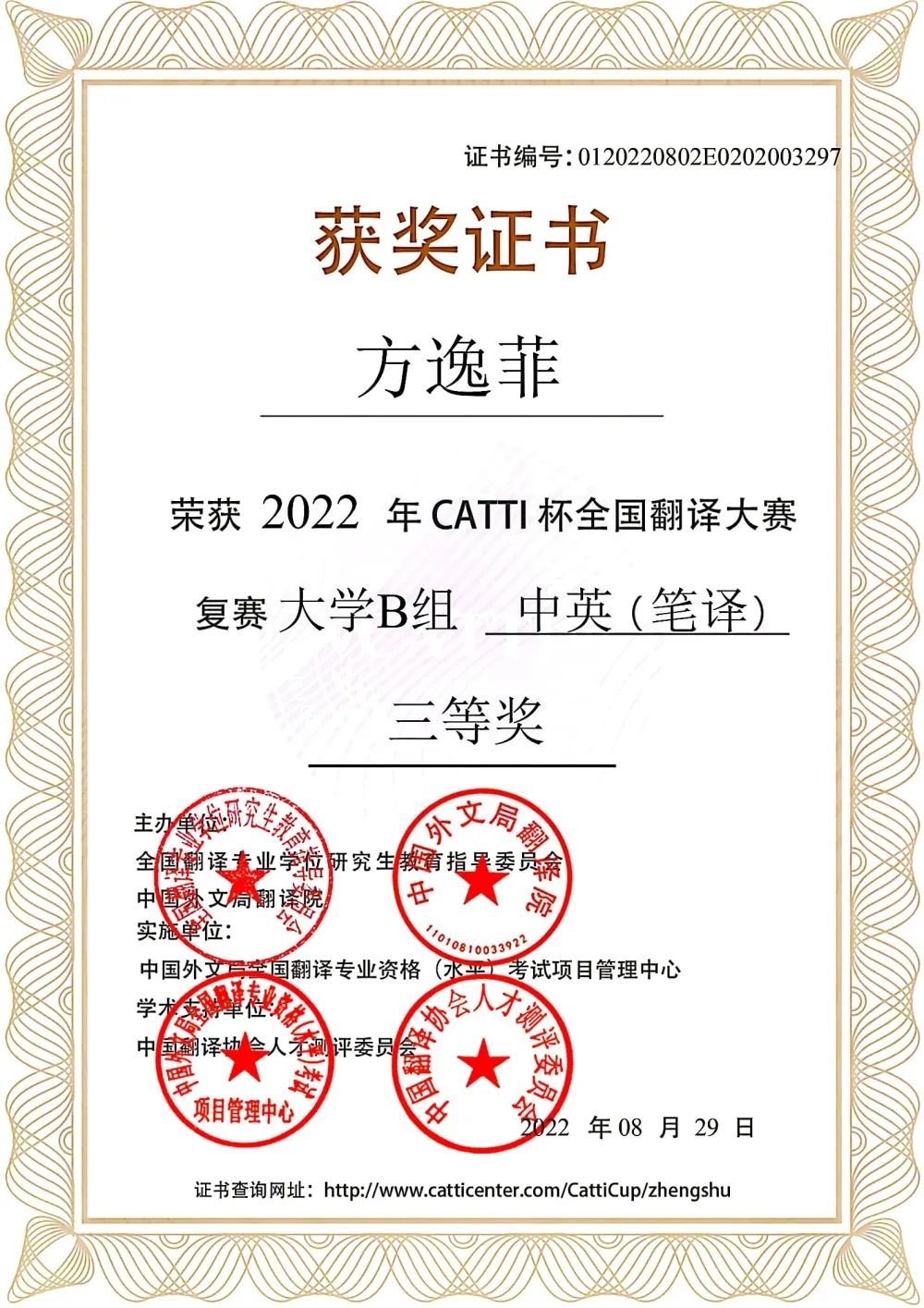 2022年8月荣获CATTI杯全国翻译大赛复赛笔译三等奖;