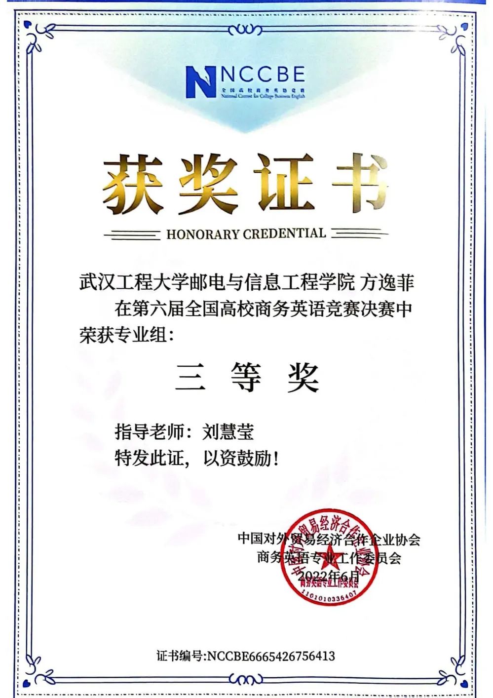 2022年6月荣获第六届全国高校商务英语竞赛决赛三等奖;