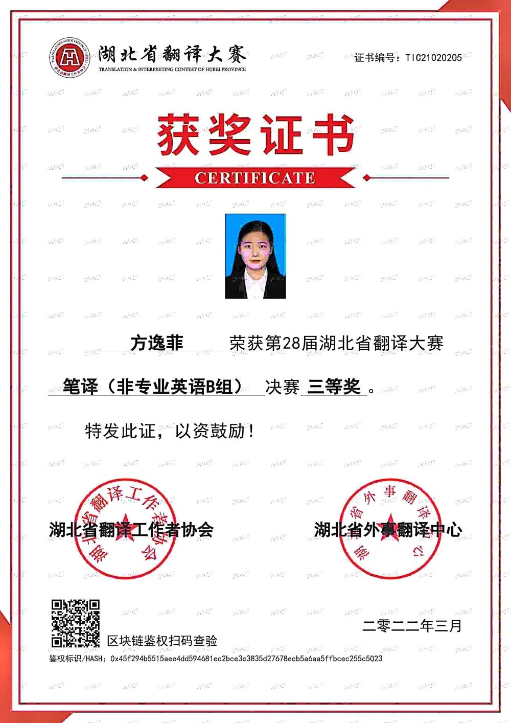 2022年3月荣获第28届湖北省翻译大赛笔译决赛三等奖;