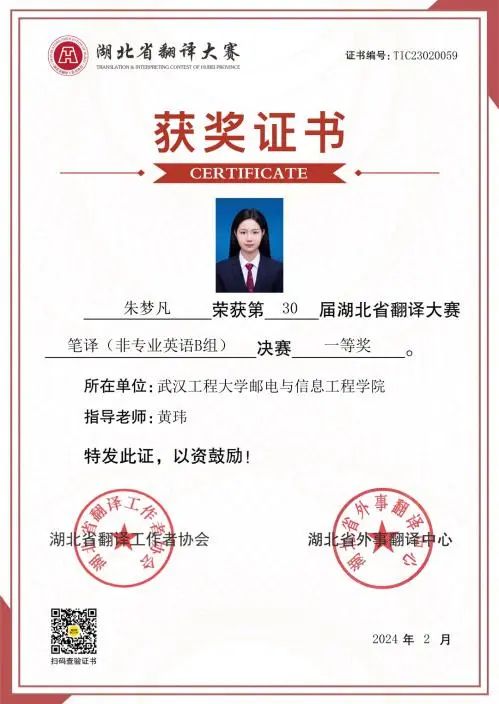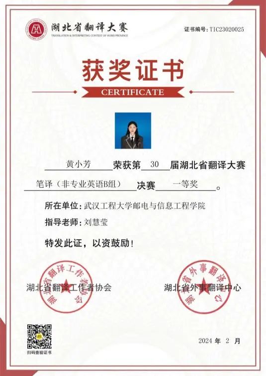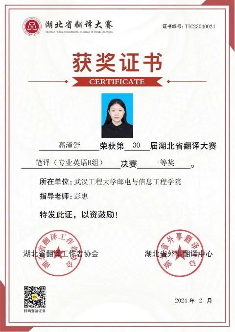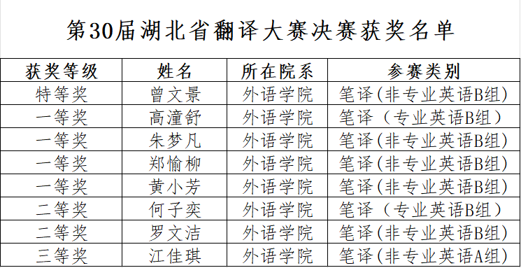 (通讯员:彭惠)近日,2023年第30届湖北省翻译大赛决赛结果揭晓。我院8名学子表现出色,在多个组别的比赛中收获奖项,其中特等奖1项、一等奖4项、二等奖2项、三等奖1项。![]() ![]() ![]() ![]() ![]() ![]()