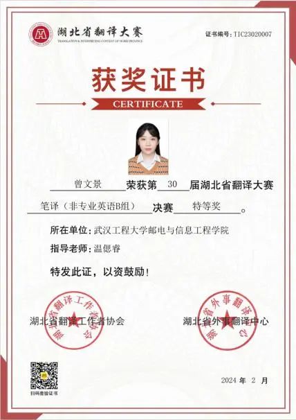 湖北省翻译大赛作为湖北省专业、权威、极具品牌价值的年度翻译赛事,已连续成功举办 30届,累计参赛逾 48万人次,为社会发掘和培养了大批优秀的翻译人才,在全国翻译界享有盛誉。大赛对学生的英语综合应用能力有较高要求,词汇涉及范围广,包括社会、经济、生活、科技的各个方面,也涉及一些时事热点词汇和中国文化及成语的表达。此次决赛难度较大,包括英译汉和汉译英两个板块,以主观题的形式考查,涉及的长难句较多,检验学生两种语言灵活转换的能力。