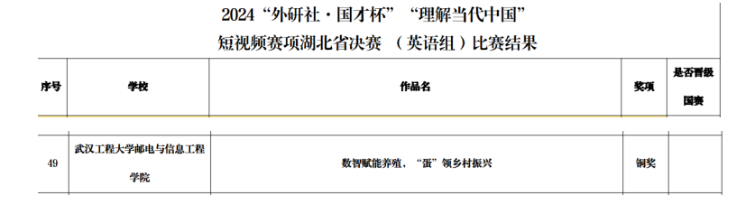 10月27日,2024“外研社•国才杯”“理解当代中国”全国大学生外语能力大赛短视频赛项湖北赛区决赛成功举办,外语学院2022级英语专业杨依雪、张力组合的“勾勾哒”队拍摄的作品“数智赋能养殖,“蛋”领乡村振兴”从110多件作品中脱颖而出,荣获铜奖。