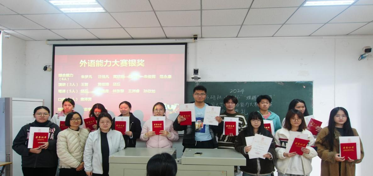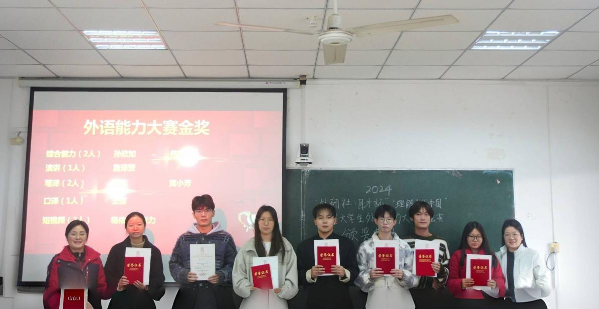 2024年11月,外语学院成功举办5场2024“外研社·国才杯”“理解当代中国”全国大学生外语能力大赛校选赛,来自全院的124名学生报名参加了此系列赛事,多名学子在校赛中获奖。11月28日,外语学院在1308教室举行了大赛颁奖典礼,外语学院院长李春英、副院长温偲睿、公共英语教研室主任吴丹、副主任郑秀娟、比赛指导教师李丹,魏然,陈平香和获奖选手代表参加了颁奖。