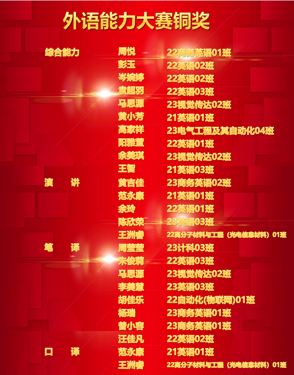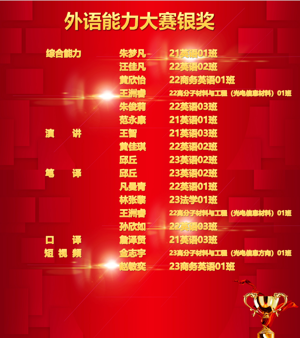 经过5场比赛的激烈角逐,共50名选手在校选赛中获奖,其中来自外语学院的孙欣如、何佳臻同学获得综合能力金奖;外语学院詹泽贤同学获演讲比赛金奖;外语学院彭玉、黄小芳2位同学获笔译比赛的金奖;外语学院王智同学荣获口译金奖;外语学院的杨依和张力同学合力斩获短视频大赛的金奖。