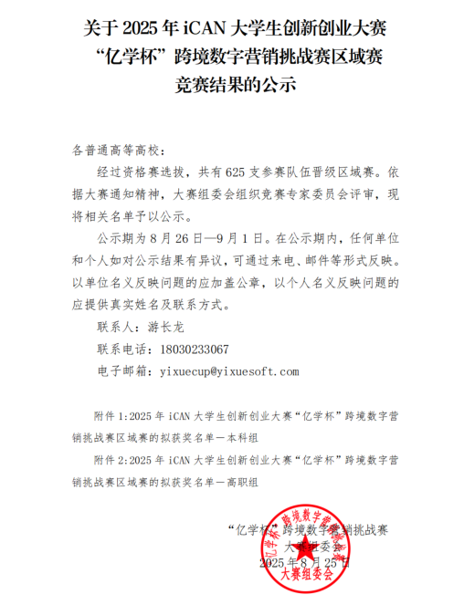 近日,2025 年 iCAN 大学生创新创业大赛 “亿学杯” 跨境数字营销挑战赛区域赛结果正式公布。我校304永利集团邱慧芳、方紫佳、郑雅文、张红永、赵君蕊五位同学组建的 “卖遍全球队”,凭借高质量的跨境数字营销策划方案及全英文直播短视频作品,成功斩获省赛三等奖,展现了我校学子在跨境数字营销领域的扎实功底与创新能力。