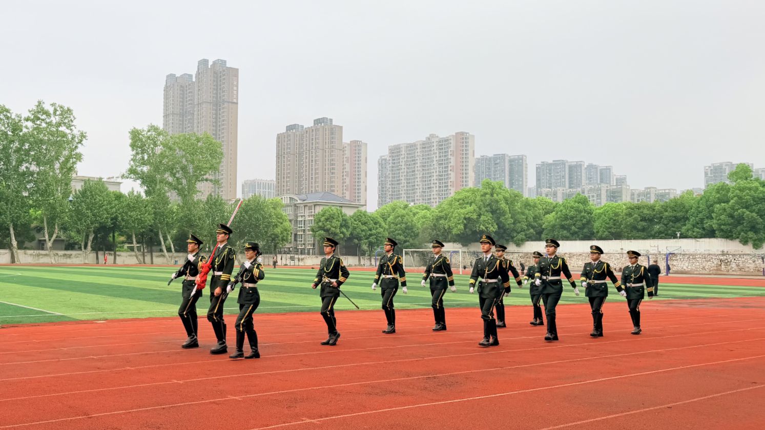 清晨七时,晨光熹微,升旗仪式在庄严隆重的氛围中拉开帷幕 。国旗班成员昂首挺胸,迈着整齐划一、铿锵有力的步伐,护送五星红旗走向升旗台 。伴随着《义勇军进行曲》激昂高亢的旋律,鲜艳的五星红旗冉冉升起、迎风飘扬,全体师生肃立行礼,共唱国歌。